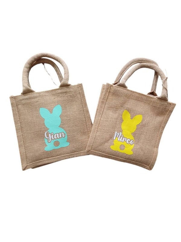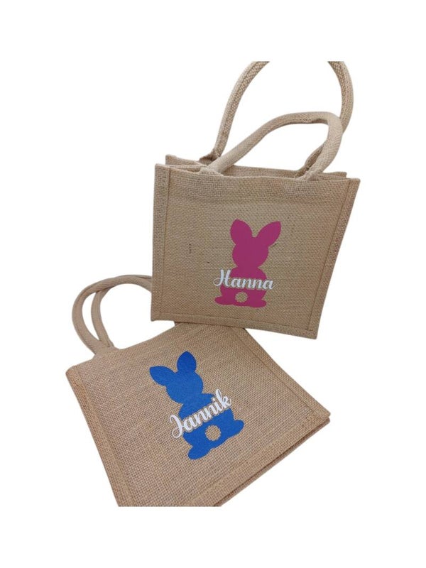 Geschenktasche aus ökologischem und nachhaltigem Jutegewebe, mit wattierten Baumwollgriffe mit deinem Wunschname und deiner Wunschfarbe vom Hase.